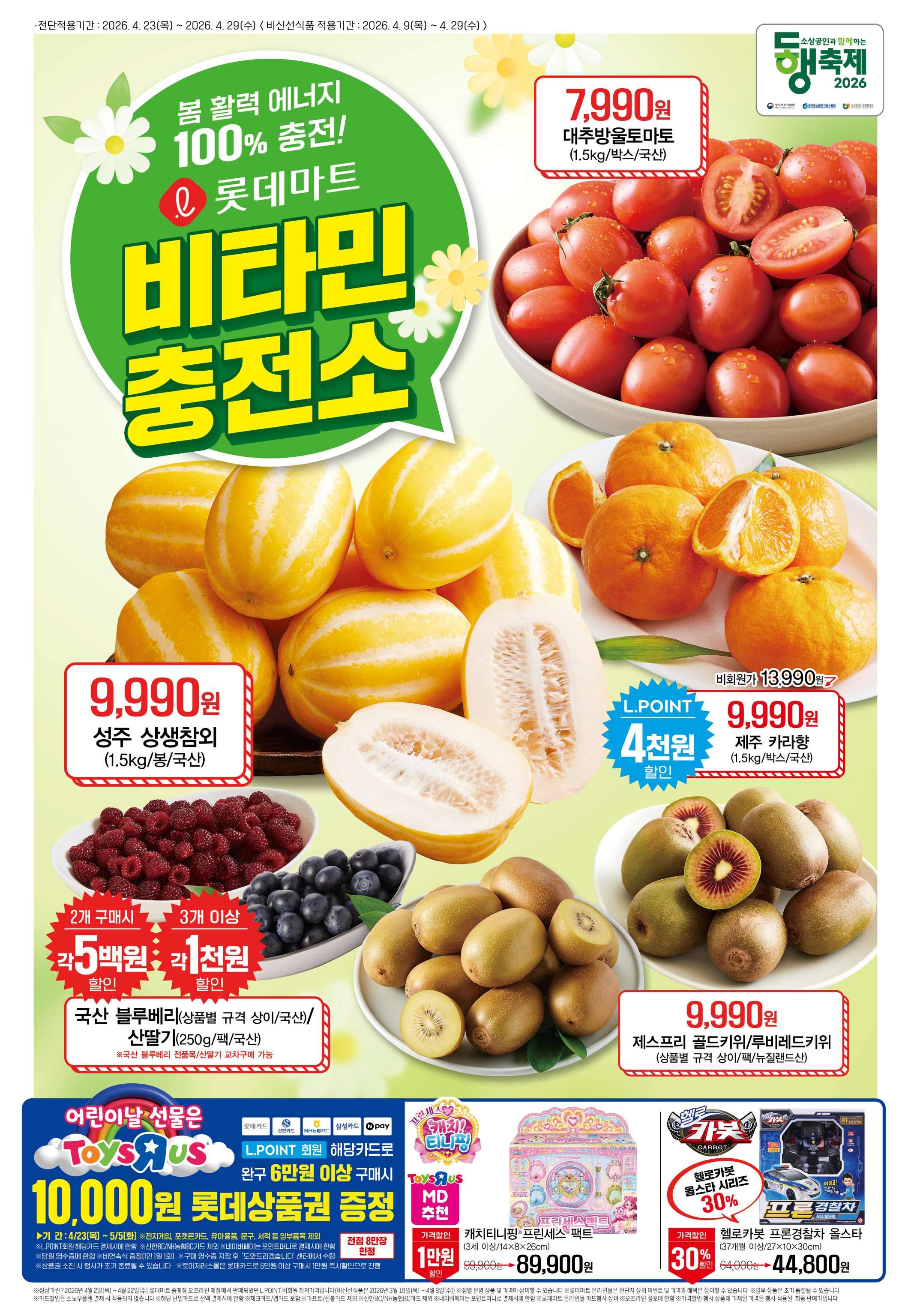 홈플러스 ‘심플러스’ 전단은 2026년 4월 23일(목)~4월 29일(수)까지 진행되며, PB 브랜드 ‘심플러스’ 상품과 신선식품, 베이커리·델리, 생활용품, 완구까지 대폭 할인됩니다.특히 서해안 꽃게 100g 990원, 태국산 신선란 5,890원, 어린이날 완구 최대 65% 할인 등 실속 있는 혜택이 핵심입니다.행사 개요기간: 2026년 4월 23일(목) ~ 4월 29일(수)주제: PB 브랜드 ‘심플러스’ 중심 초특가전혜택: 신선식품·델리·베이커리·완구 최대 65% 할인, 카드사 제휴 추가 할인, 앱 회원 전용 쿠폰신선식품 특가서해안 꽃게 (국내산/해동): 100g 990원 (앱 회원 50% 특가)태국산 신선란 (30구): 5,890원 (전점 한정 수량)국산콩 두부 (300g×2입): 3,490원냉동 ..