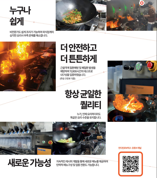 최근 TV 예능프로그램에서 보고 와~ 저건 정말 획기적이고 마음을 확 사로잡는 아이템이 있었습니다.그것은 바로 자동으로 웍질을 해주는 기구였습니다. 검색해 보니 만다린로보틱스라는 회사의 주방 기구였습니다. 결국 언젠가는 음식을 만드는 요리사 또한 이렇게 기계&AI에 의해 대체되지 않을까 하는 생각이 들었답니다. 1. 만다린로보틱스 개요만다린로보틱스는 2018년 설립된 한국의 스타트업으로, 주방 자동화 시스템을 개발하는 기업입니다. 본사는 서울 강서구에 위치하고 있으며, 대표자는 김민규입니다.이 회사는 음식 조리 로봇을 포함한 다양한 자동화 설루션을 제공하며, 최근 CES 2025에서 혁신적인 조리 로봇을 선보이며 주목받았습니다. 2. 주요 사업 및 기술만다린로보틱스는 엑스웍(X-Work)이라는 조리..