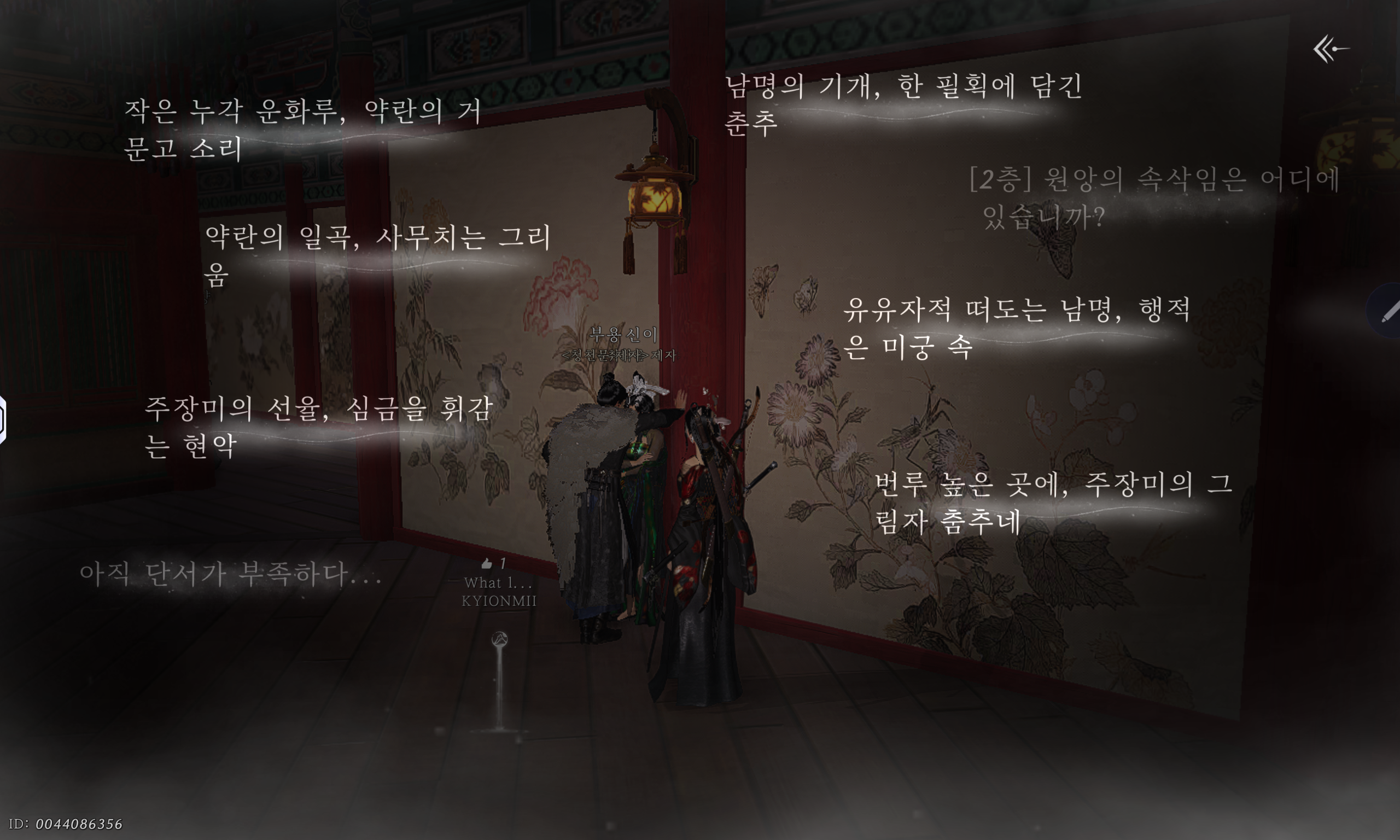 연운 풍운회 탐색하며 단서 수집. [2층]원앙의 속삭임은 어디에 있습니까? 연운 플레이 중 풍운회에서 단서 찾기 미션이 있습니다. 저는 6가지의 단서는 찾기 쉽지만 한 가지 어려운 부분이 있었어요. [2층] 원앙의 속삭임은 어디에 있습니까? 이 부분 어떻게 찾는지 아래 자세히 알려드릴게요!해당 단서 상태에 나오는 글로는 죽었다 깨나도 못 찾습니다. 아래 내용은 무시하세요. 우선 2층 복도에서 '부용'을 찾습니다.부용한테 물건취하기를 하면 되는데요. 이렇게 부용이 가지고 있는 문서를 소매치기하면 해결됩니다. 소매치기 후 아래 사진부분을 들어가야 하는데 시큐리티가 입구를 막고 있습니다.바로 옆에 테라스로 나가서 방에 들어가시면 됩니다. 이상으로 연운 플레이 중 막혔던 부분인 풍운회 단서 찾기 [2층] 원앙의 속삭임은 어디에 있습니까? 에 대해 알려드렸습니다. 게임.팁 2026.01.12