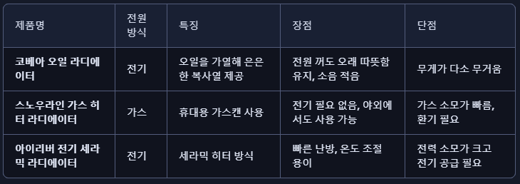 - 차박·오토캠핑: 전기 공급이 가능하다면 코베아 오일 라디에이터가 가장 안정적입니다.