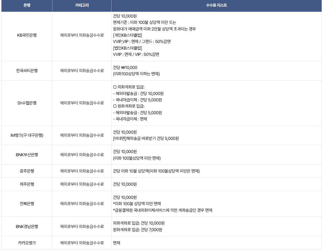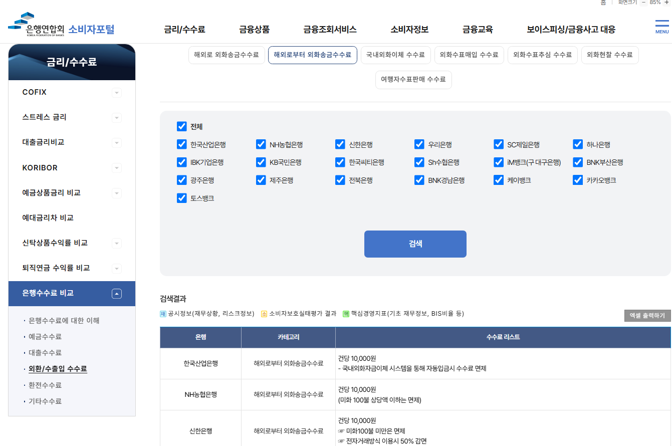 사이트 접속 후에 '외화/수출입수수료 - 해외로부터 외화송금수수료'를 선택 후 전체 은행 체크하여 검색하면 은행별 외화 송금 수수료를 한눈에 비교할 수 있습니다.