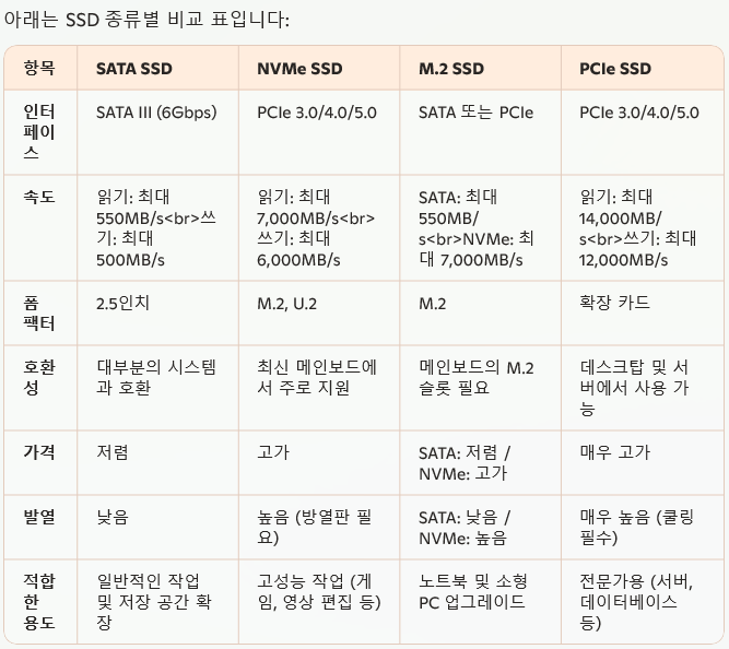 - 고성능 작업: NVMe SSD는 게임, 비디오 편집 등 고사양 작업에 최적입니다.