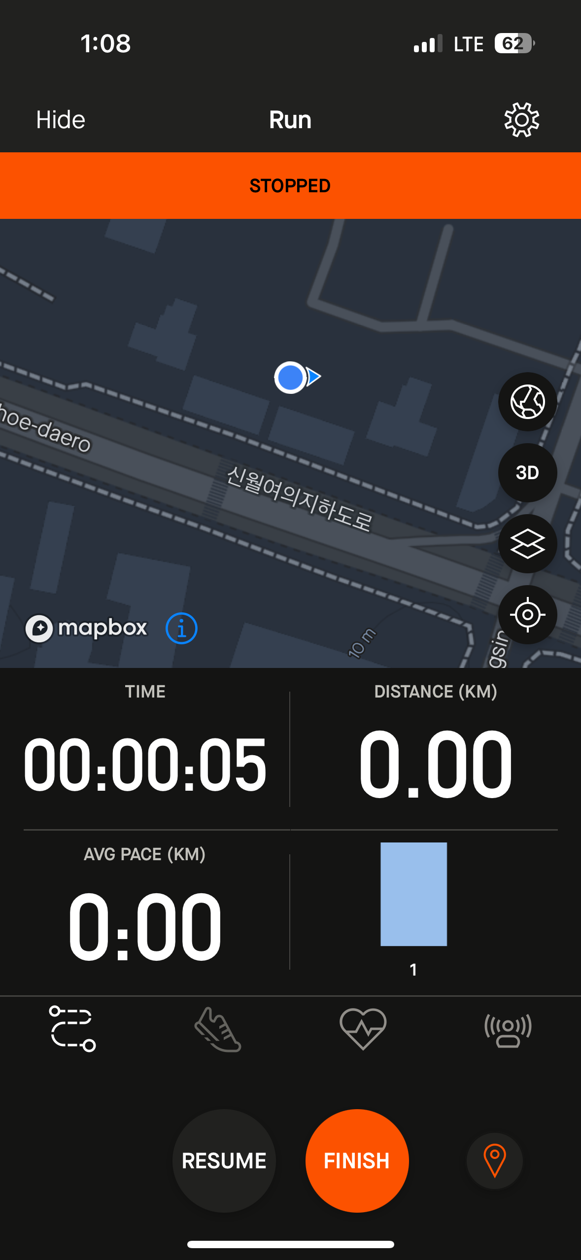 스트라바 앱에서 가운데 아래에 꼭 Run으로 선택 후 Record버튼 클릭해야만 한다.