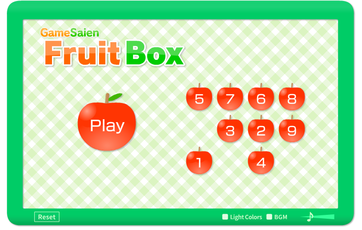 Drag the mouse to exactly enclose some apples so the numbers in the apples total 10. You get 1 point for each apple. The colors (apples etc.) will be lighter when checking "Light Colors". The game in this page runs on PC and mobile (iPhone,iPad