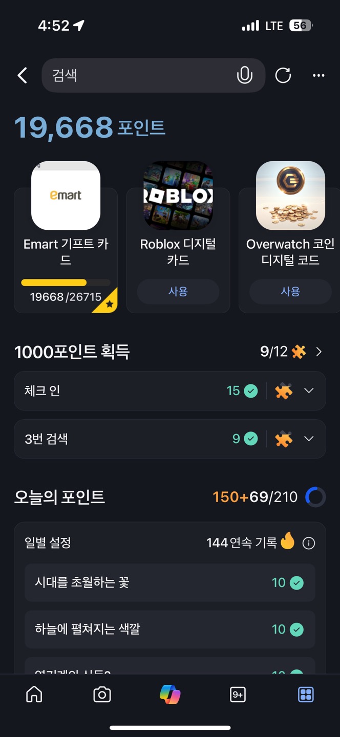 Bing | - 기사 검색 등의 형태로 일일 퀘스트 수행이 간단함 - 이마트 상품권 또는 게임 머니로 교환 가능 |