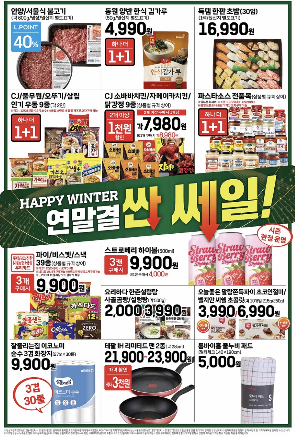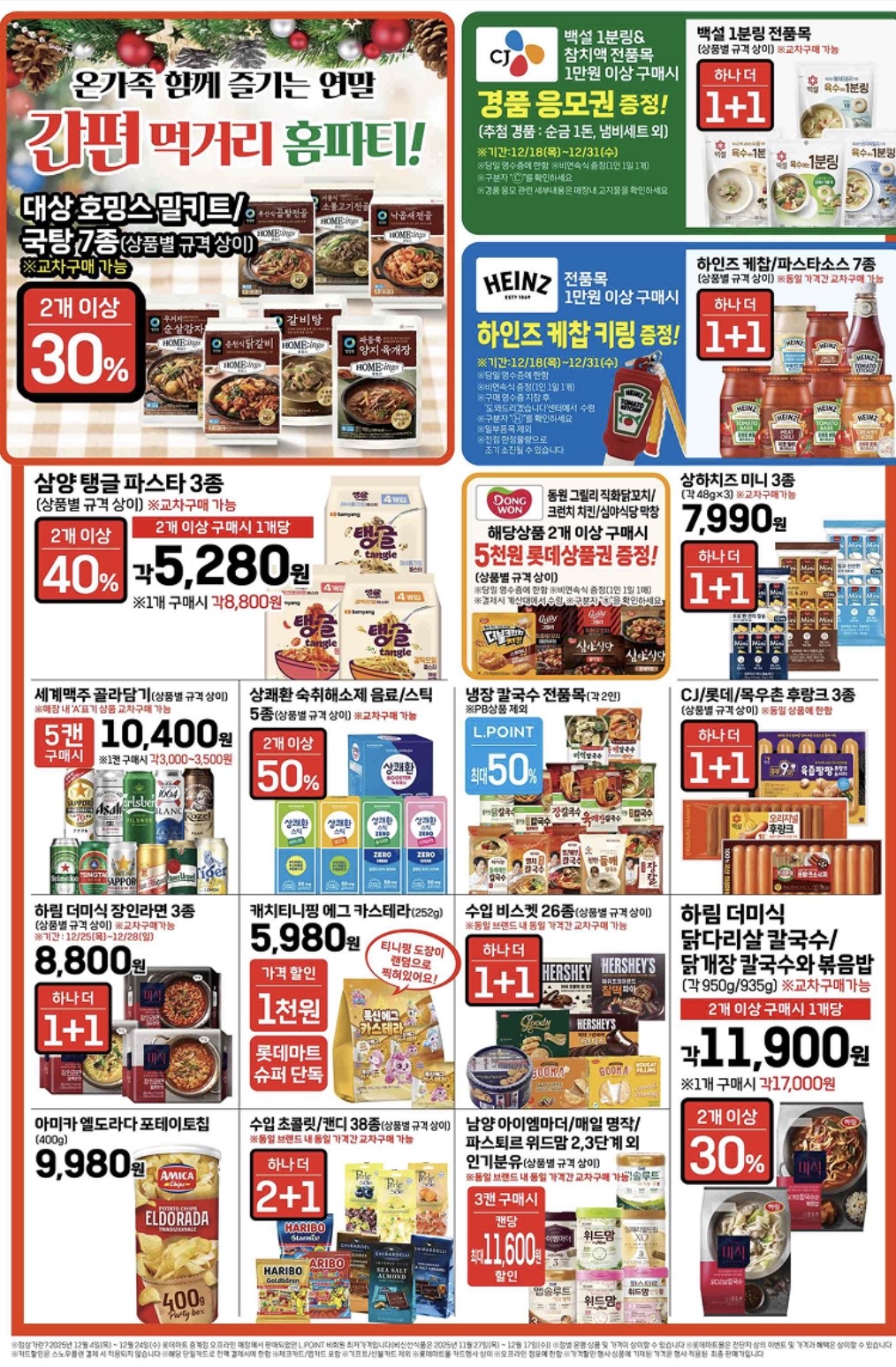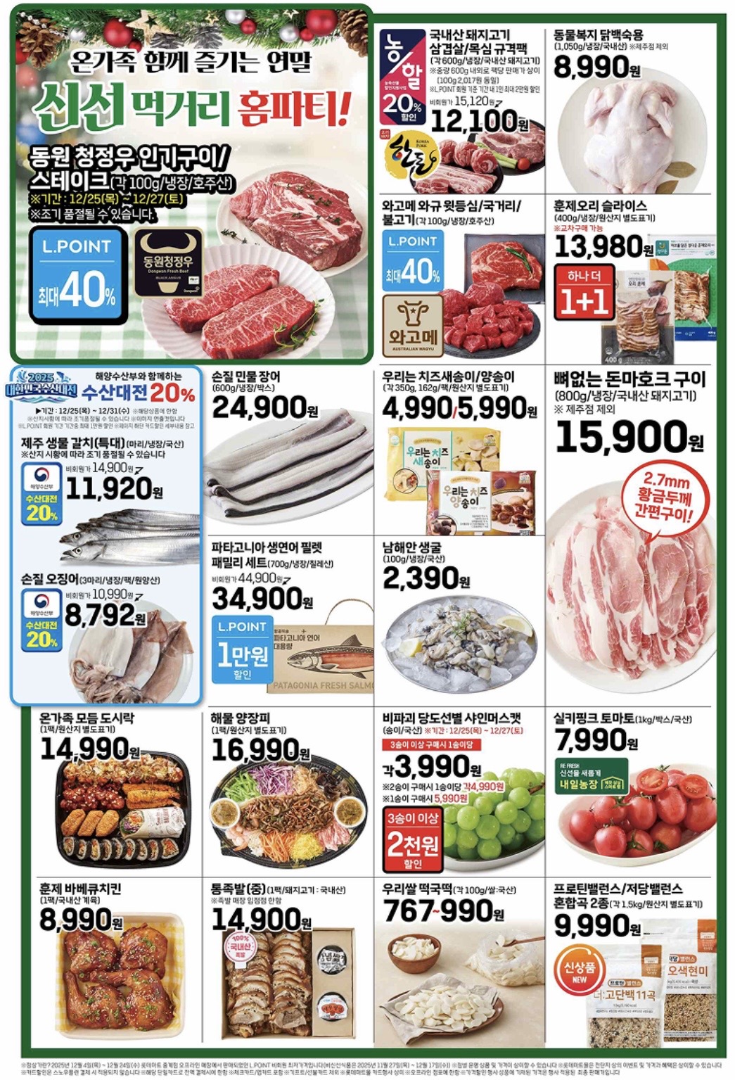 정리하면, 이번 전단지는 연말 홈파티 준비(고기·회·과일) 실속형 장보기(간편식·생필품)를 동시에 챙길 수 있는 마지막 대형 행사입니다.