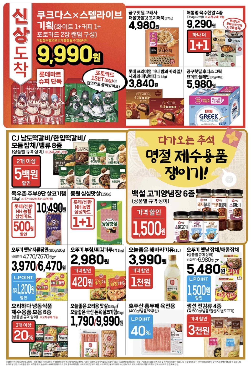 🛒 롯데마트의 9월 25일(목)부터 9월 29일(월)까지 진행되는 ‘쇼핑대전’ 전단지 주요 할인 품목을 요약해 드릴게요.✨