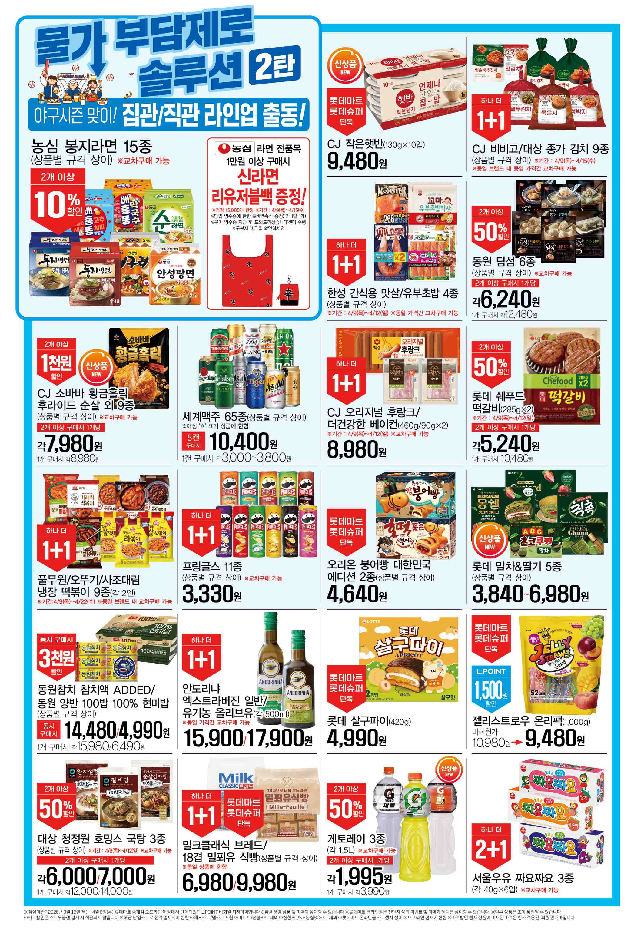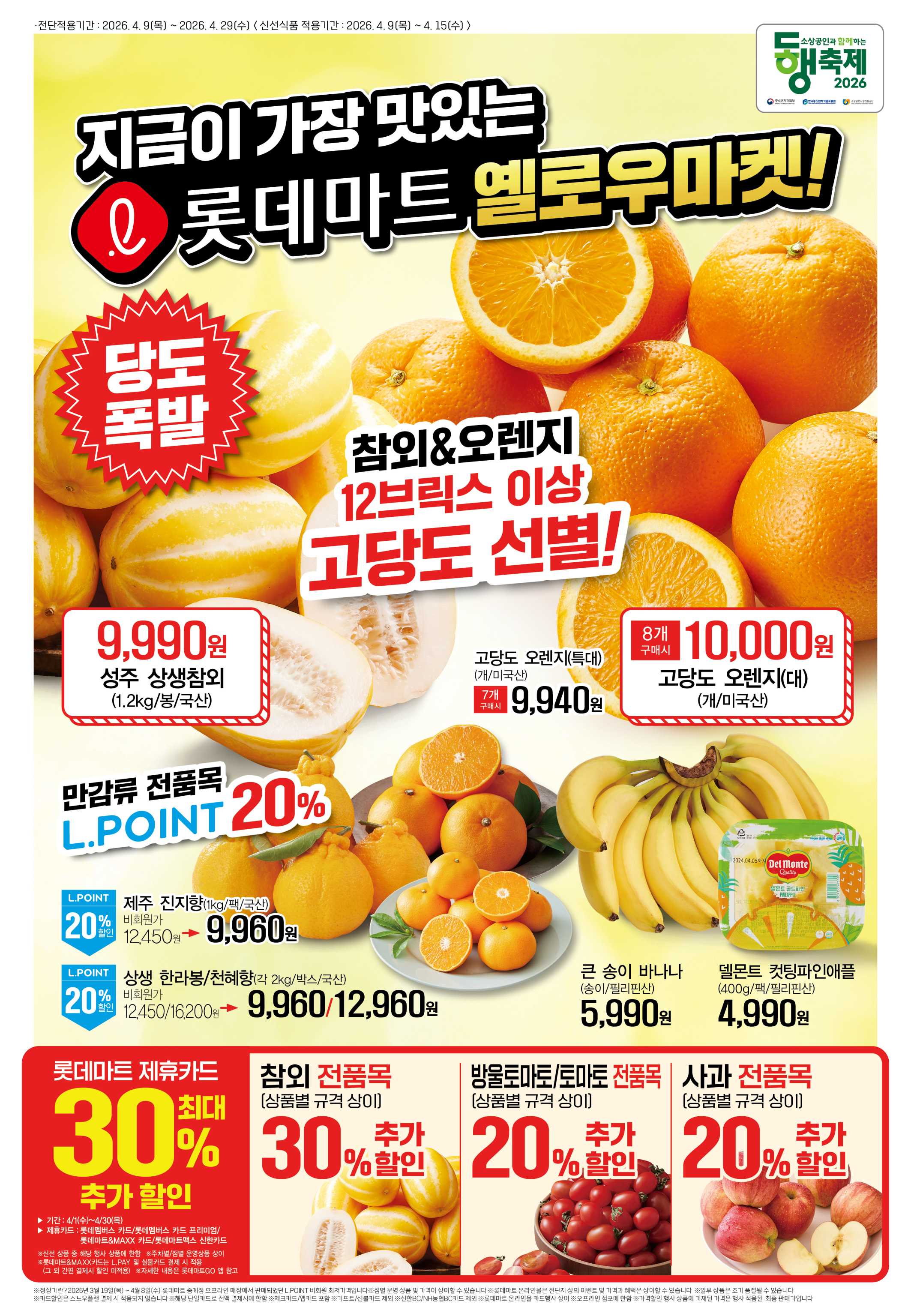 롯데마트 ‘옐로우마켓’ 전단지(2026년 4월 9일~29일)는 신선식품 특가, 간편식·간식류 할인, 생활용품 행사까지 폭넓게 구성되어 있습니다. 특히 참외·한라봉·천혜향 등 제철 과일과 프링글스 1+1, 전복·닭강정 등 인기 먹거리 행사가 눈에 띕니다.
