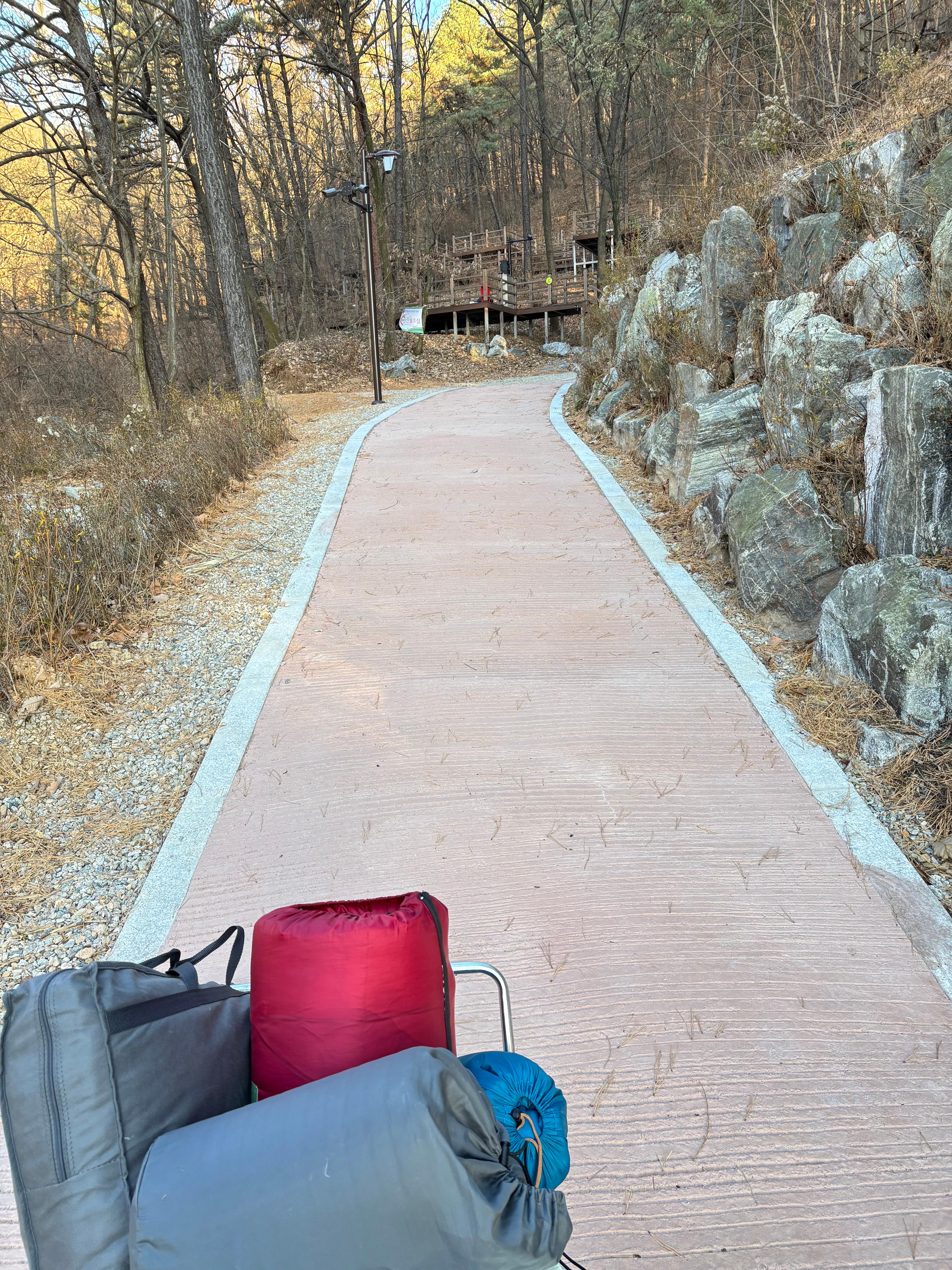 아래 영상에는 주차장에서 야영데크까지 가는 길을 확인하실 수 있습니다. 평지처럼 보이지만 오르막길이고 거리도 상당합니다.