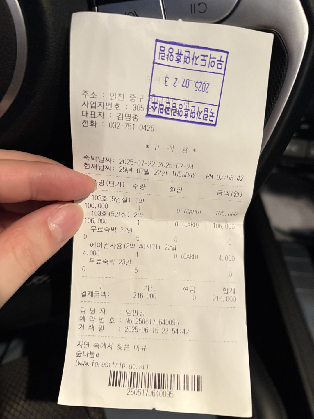 게다가 무의도 숙박객은 장화 또는 소금 중 한 가지를 무료로 제공해 준다고 합니다. 체크인하는 곳에서 영수증에 저렇게 도장을 찍어서 하나개 해수욕장 내에 포내어촌체험마을하는 곳에 가져가셔서 제출해야 합니다.