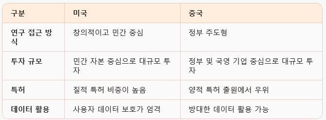 또한, 양국은 AI 연구 인재 확보에서 치열한 경쟁을 벌이고 있으며, 연구 인프라와 인재 풀 확장을 위해 대규모 투자를 아끼지 않고 있습니다.