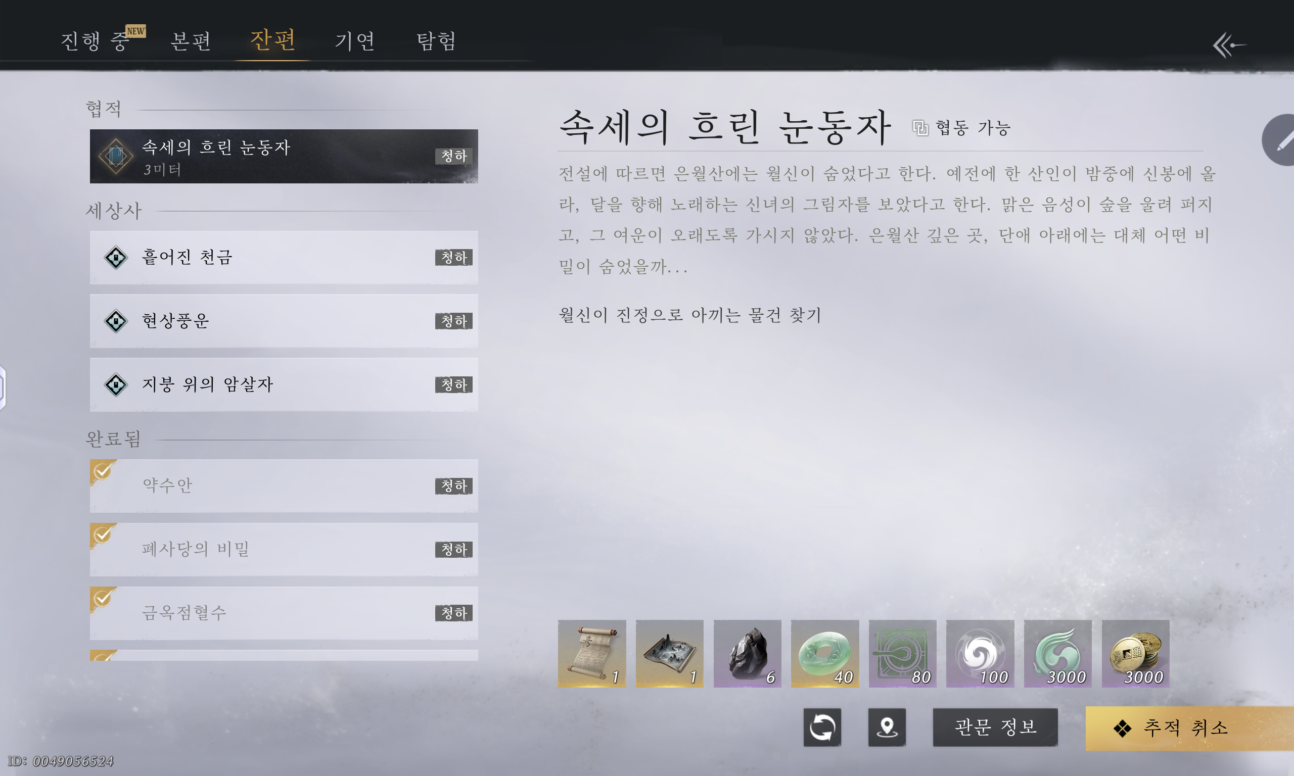 여기까지 연운 [잔편] '속세의 흐린 눈동자(월신이 진정으로 아끼는 물건 찾기)'에서 찾으러 가는 길에 대해 알려드렸습니다.