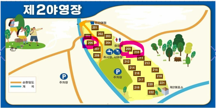2야영장 쪽으로 명당을 추천해드린다면, 계곡이 바로 앞에 펼쳐져있는 206번 사이트와 프라이빗하면서도 화장실도 가까운 209, 210 사이트를 추천드려요.