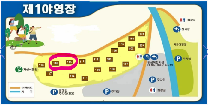 저는 115번을 예약했습니다. 왜냐하면 첫째로 주차장에서 매우 가깝습니다. 두번째로 프라이빗합니다. 화장실이나 취사장과는 거리가 약간 있지만 아주 멀지 않기때문에 저에게는 오히려 지나다니는 사람없고 좋았답니다.