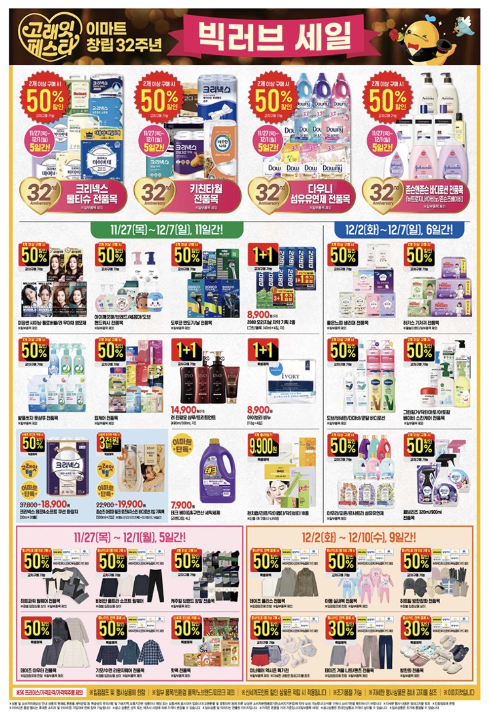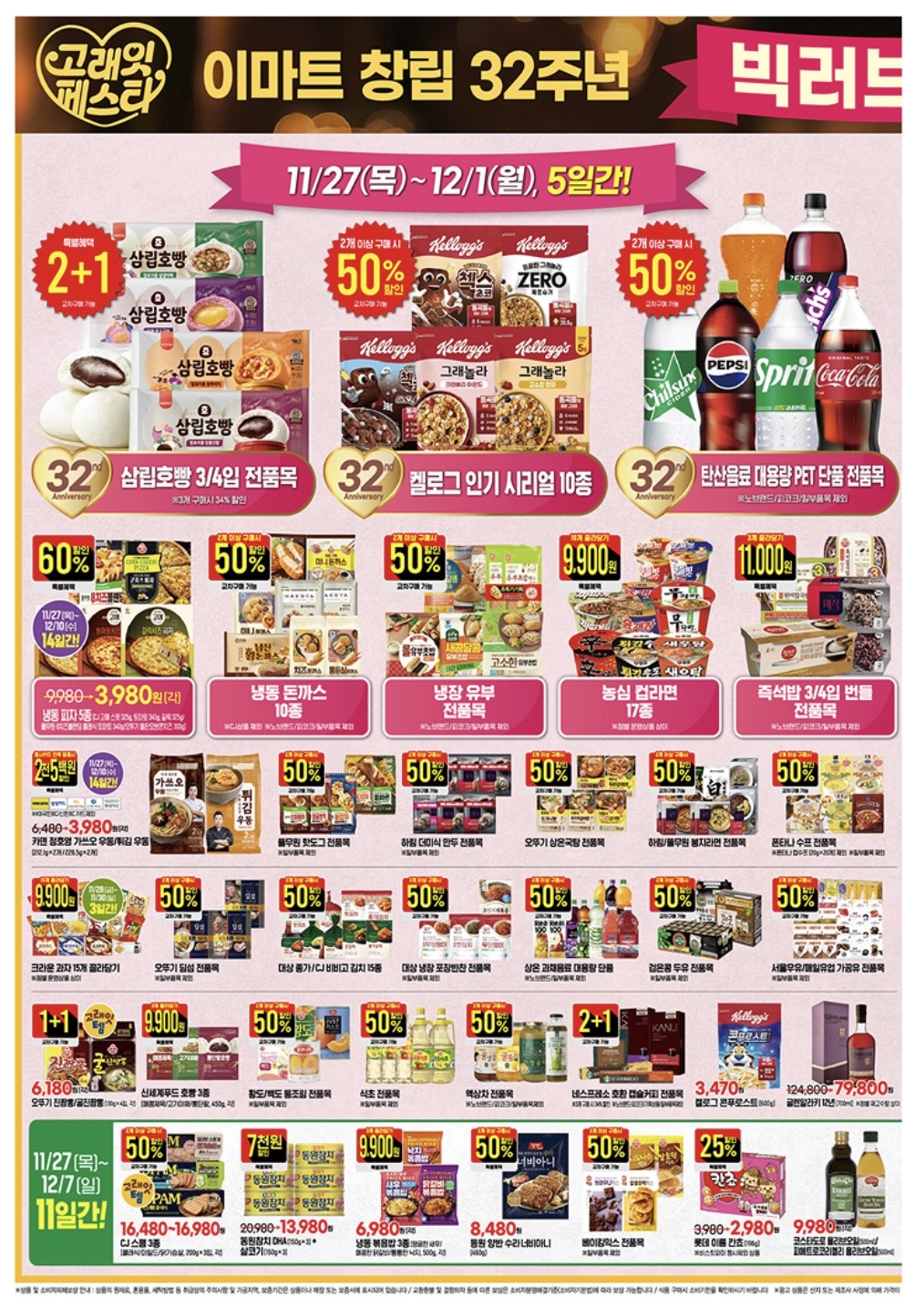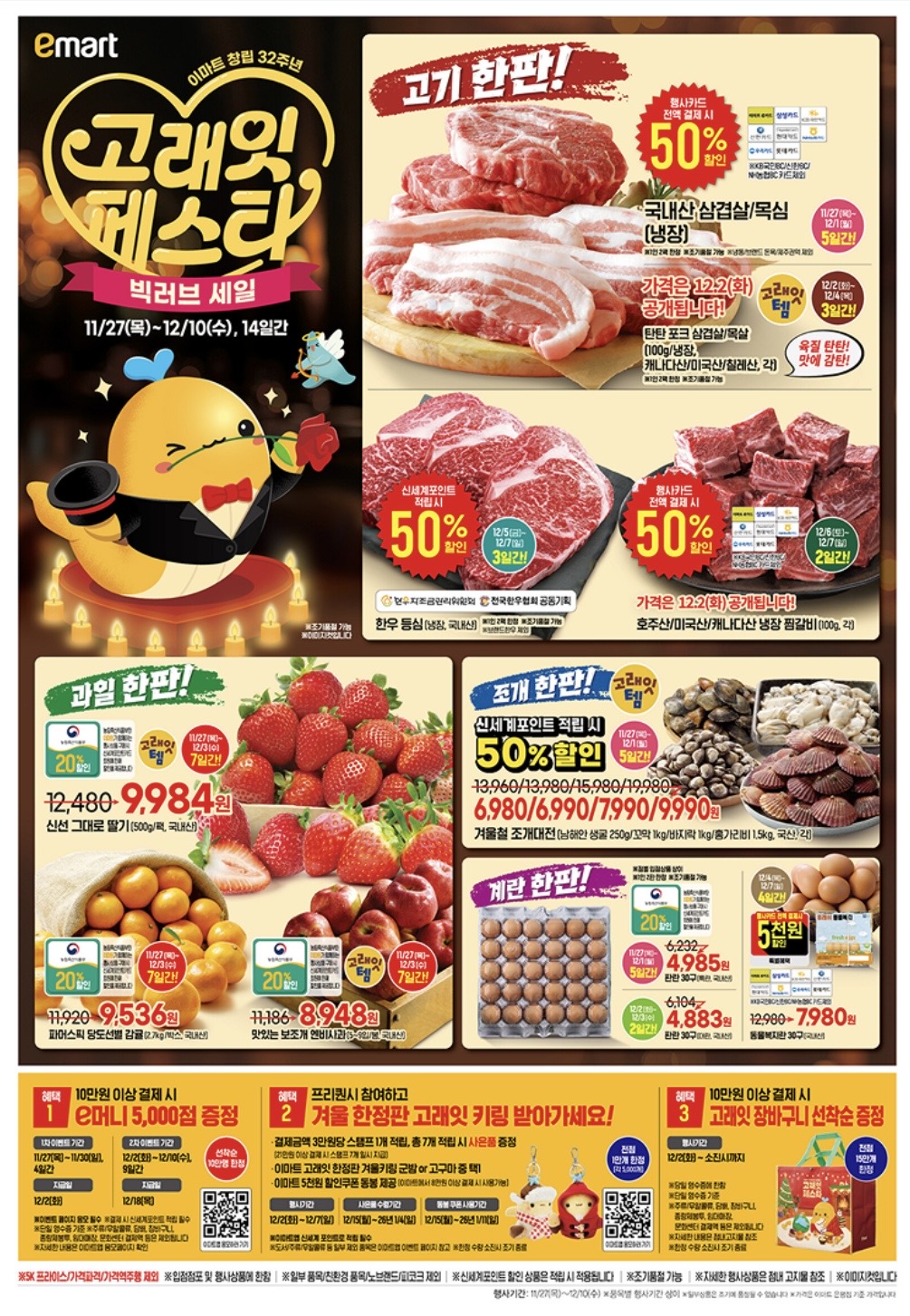 이마트 창립 32주년 기념 ‘고래잇페스타’는 11월 27일~12월 10일, 총 14일간 진행되는 역대급 할인 행사로 신선식품, 가공식품, 와인, 디지털 기기까지 대규모 물량을 반값·특가에 선보입니다.