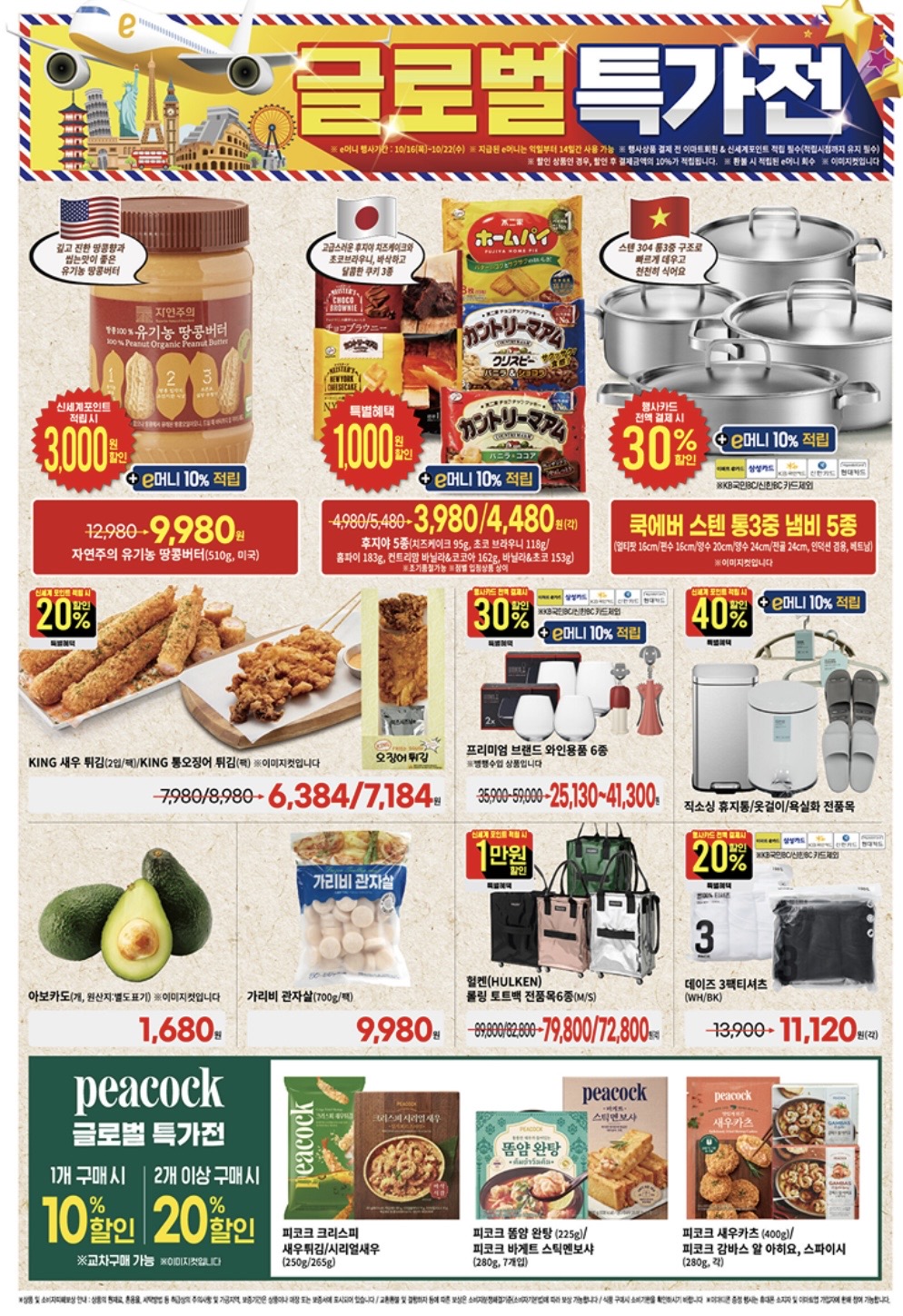 이마트 '글로벌특가전'(10월 16일~22일)에서는 냉동과일, 견과류, 올리브오일, 이불, 피자, 치즈, 식기 등 다양한 품목을 최대 50% 할인하며, 행사카드 결제 시 추가 할인과 e머니 적립 혜택도 제공됩니다.