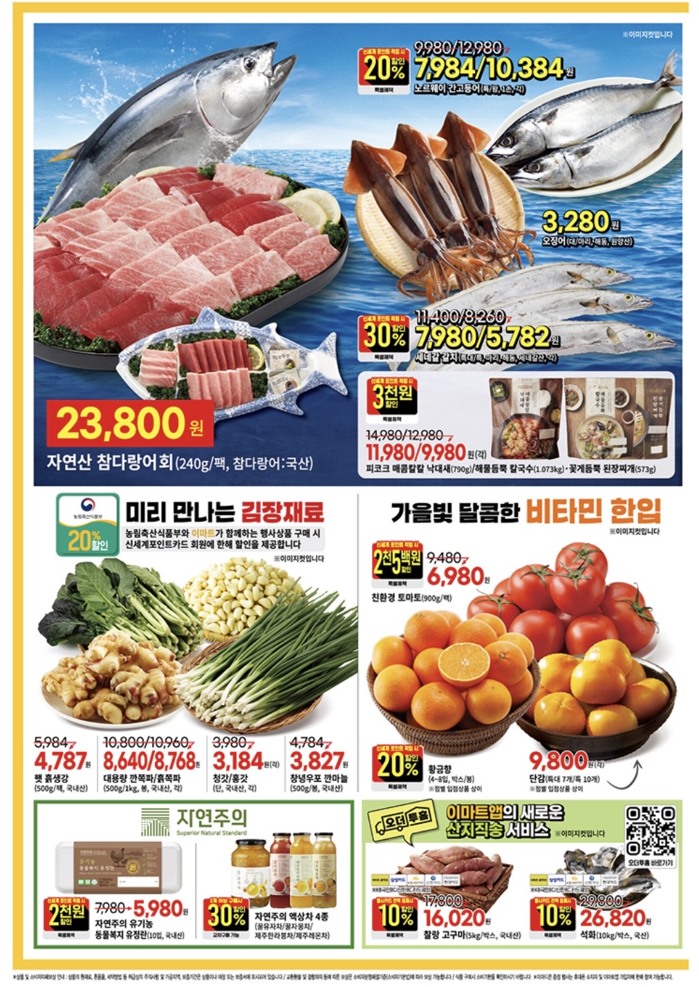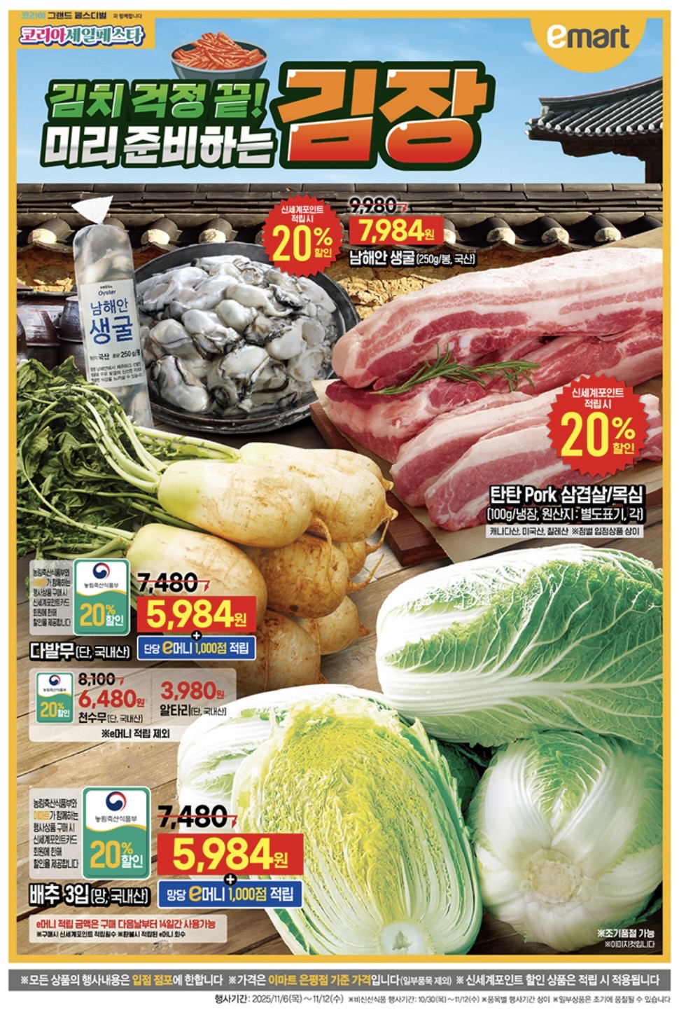 이마트 11월 6일~12일 세일 전단지 요약: 김장철 맞이 김장 재료 할인과 함께 육류, 해산물, 과일, 자연주의 제품 등 다양한 품목이 할인 중입니다. 일부 품목은 행사 기간이 상이하니 방문 전 확인이 필요합니다.