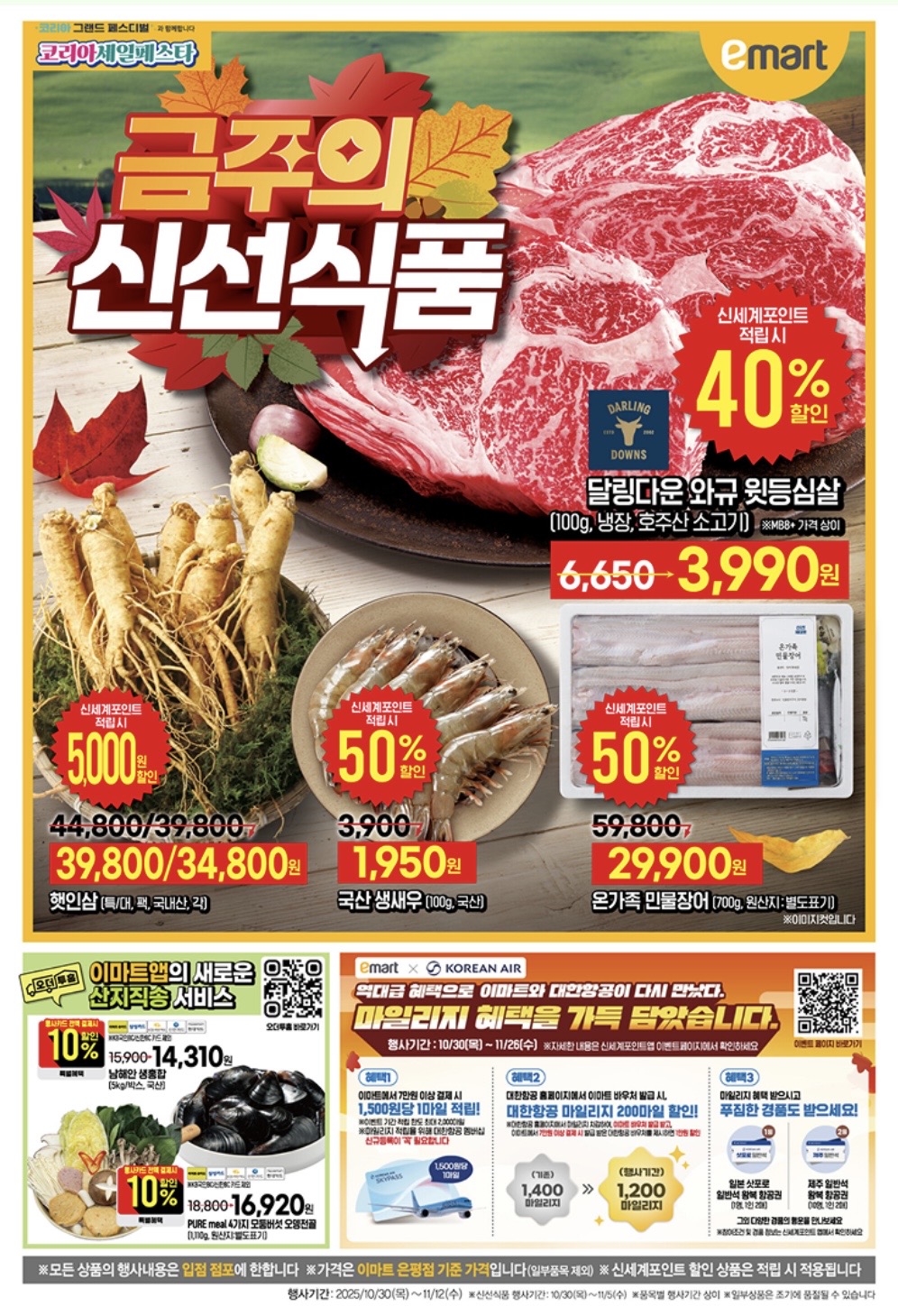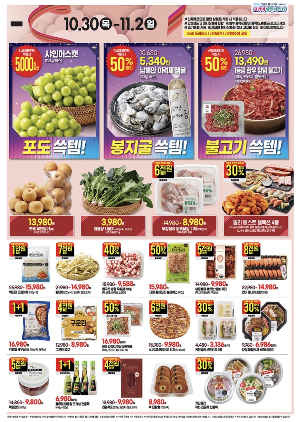- 삼겹살/목심 (10/30~31): 신세계포인트 적립 시 100g당 1,490원 (50% 할인)