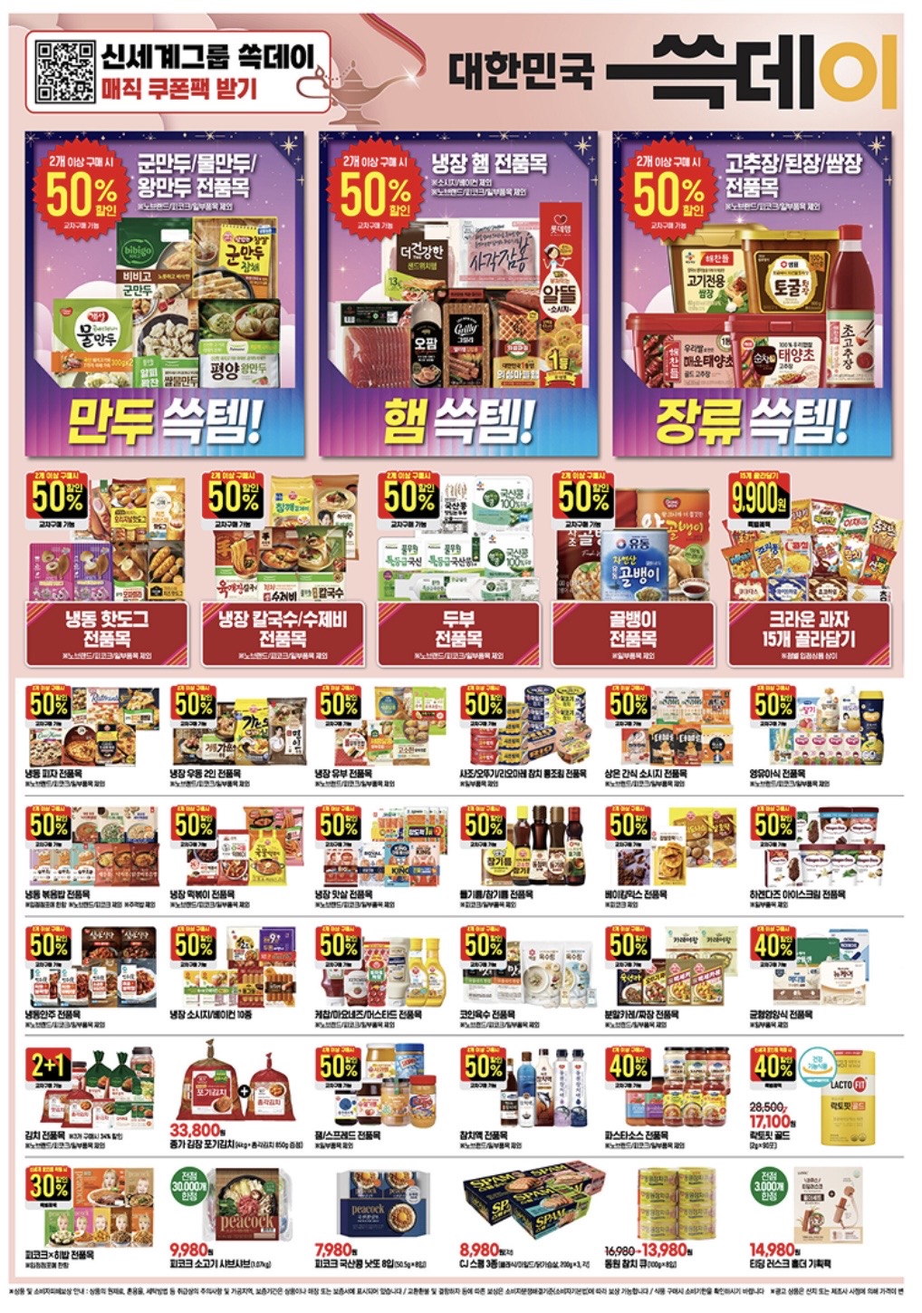 - 냉동식품·만두·햄·장류: 1+1 행사