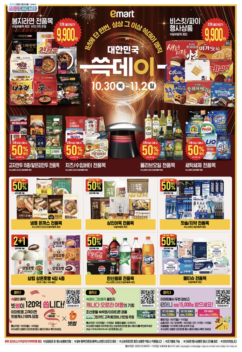 - 햇반·라면·식용유·세제류: 전품목 50% 할인