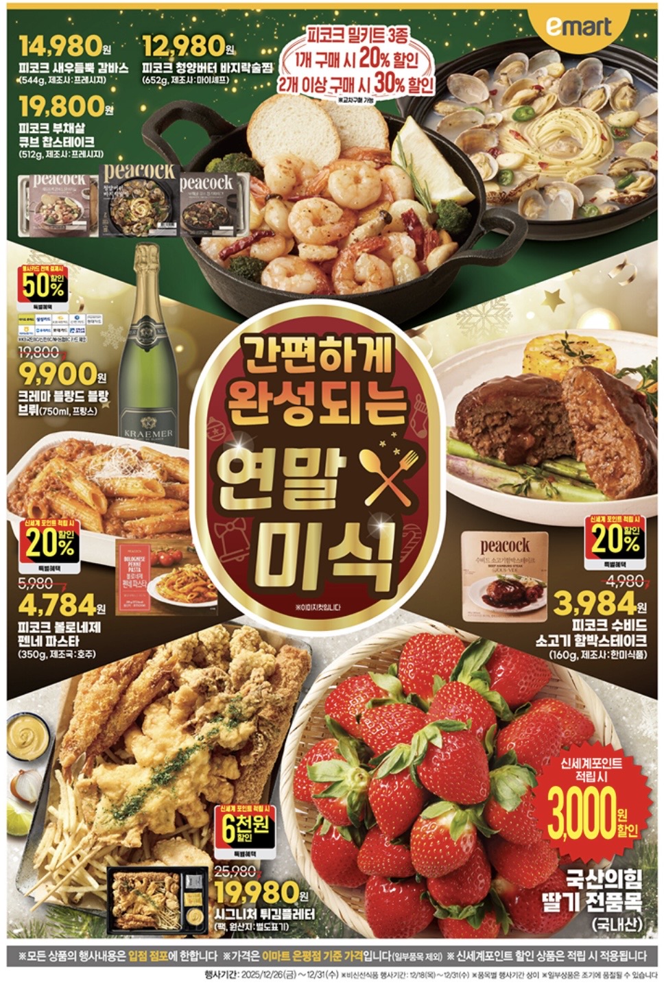 이마트는 12월 26일~31일 동안 ‘연말 미식’ 세일을 진행하며, 피코크 밀키트·키친델리 즉석조리 먹거리·스테이크·와인 등을 최대 50% 할인 판매합니다.