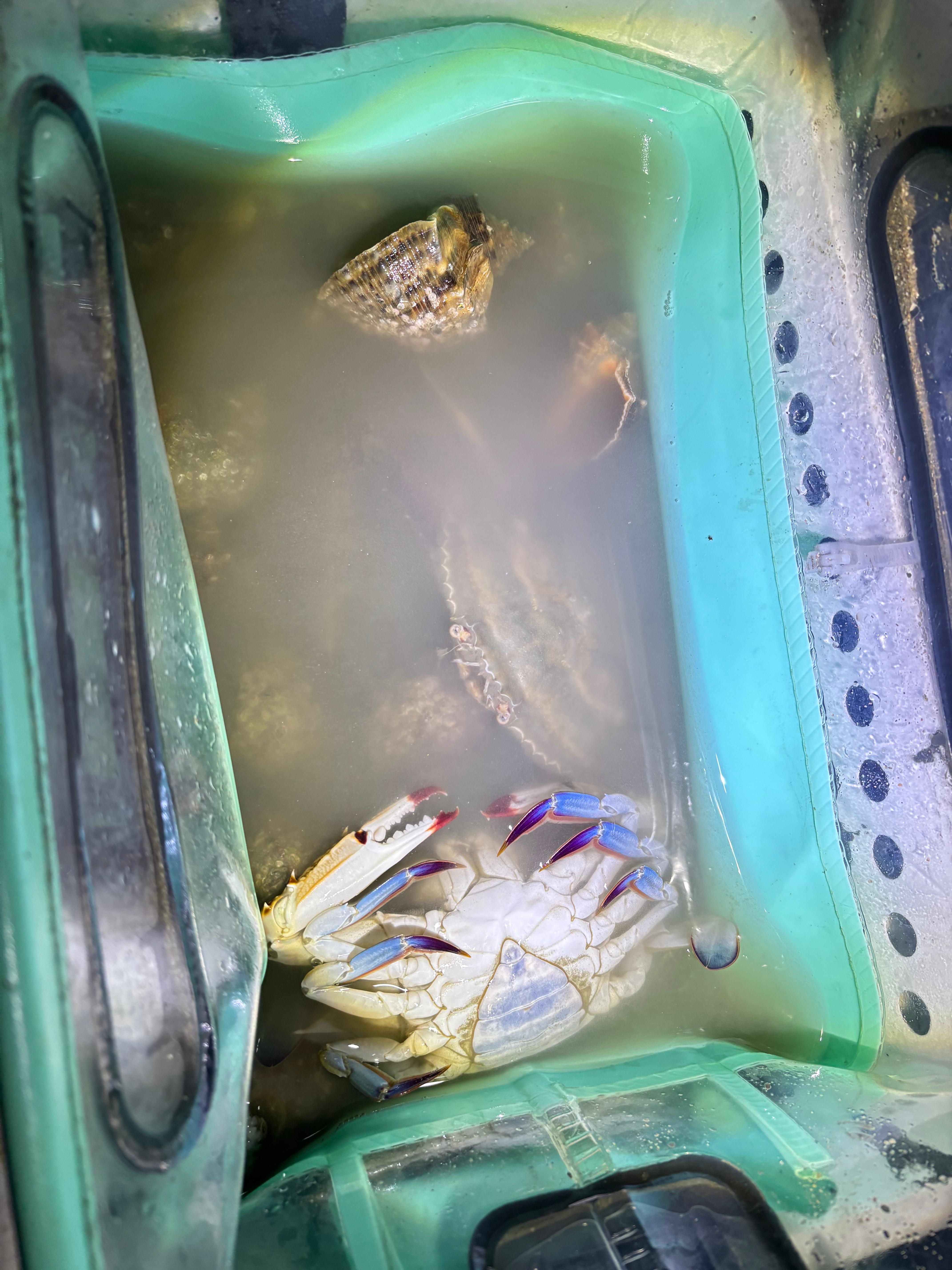 이날 같이 간 동료와 잡은 조과는 아래 사진과 같이 주꾸미 4, 갑오징어 1, 소라 15, 꽃게 2였습니다. 매우 만족스러웠어요.