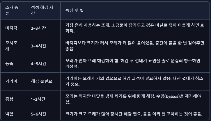 - 시간 관리: 조개 종류에 따라 2~6시간 정도 해감합니다. 너무 오래 두면 조개가 약해져 죽을 수 있습니다.