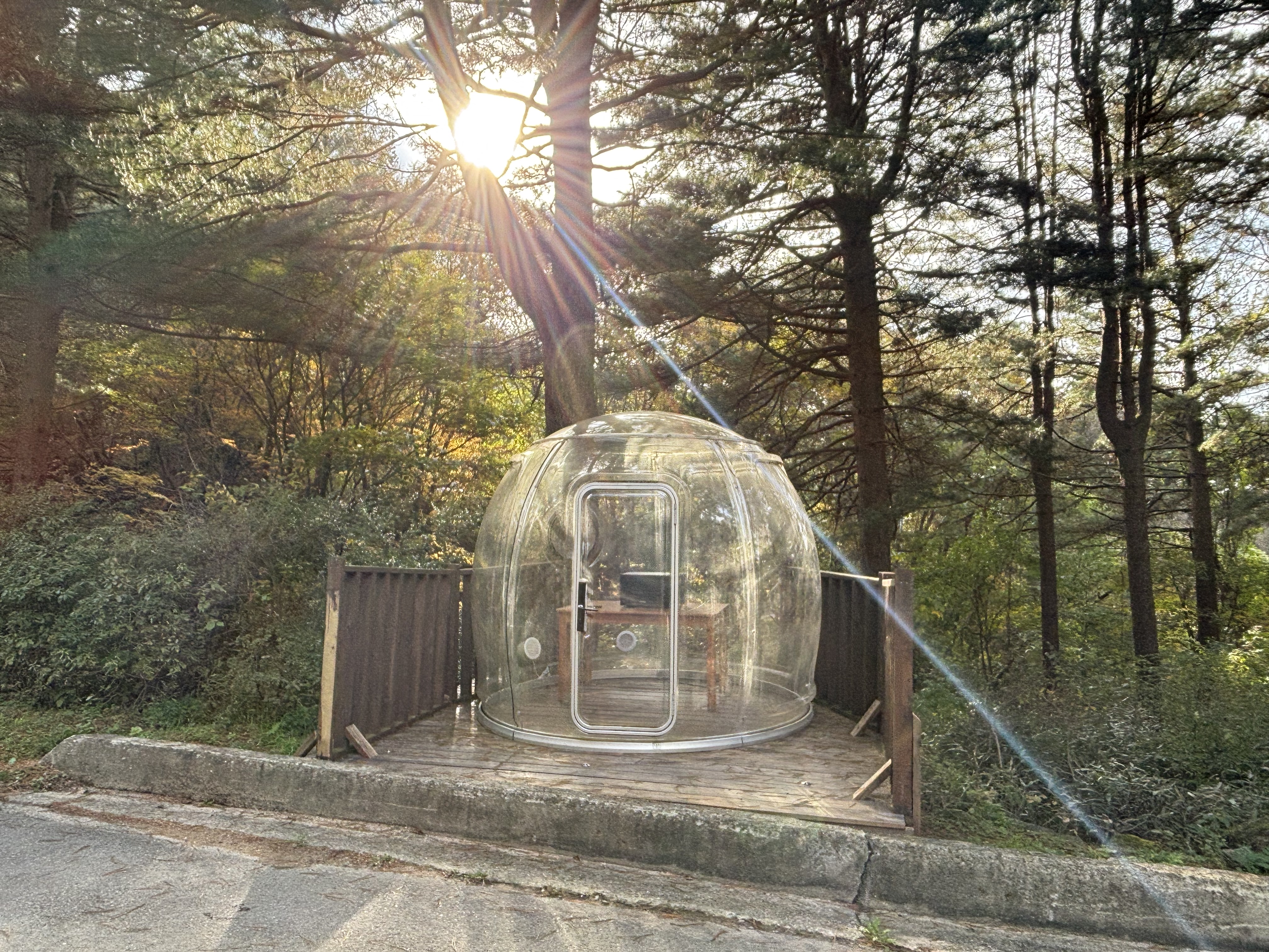 숲속의 집 근처에 설치되어 있는 투명텐트가 이뻐서 찍어봤어요. 안에는 전자레인지만 있었고요.ㅎㅎ