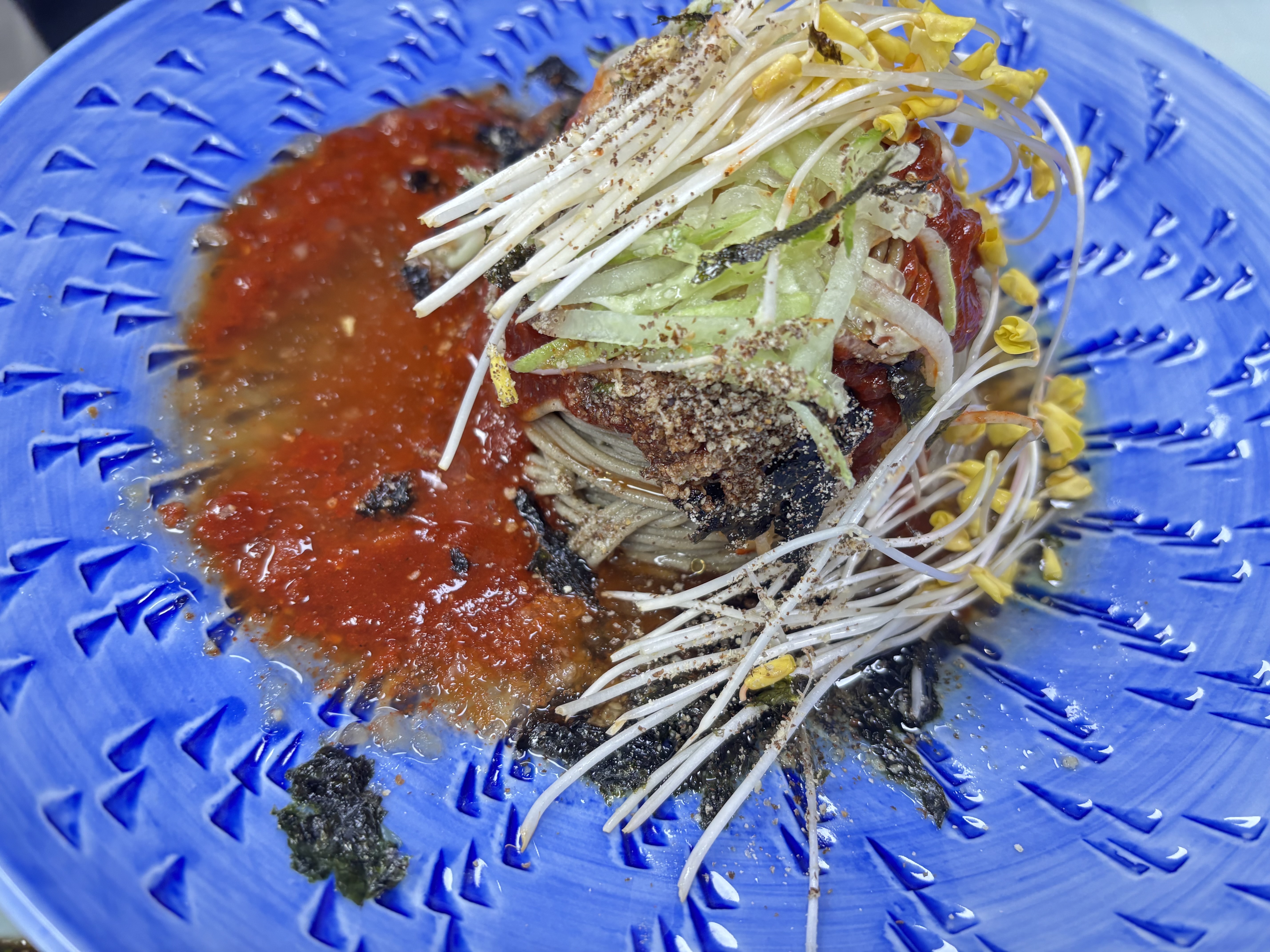 • 비빔국수 – 12,000원, 매콤한 양념이 메밀면과 찰떡궁합! 자극적이지 않고 매콤한 소스와 잘 어우러지는 감칠맛 있는 맛이었습니다.