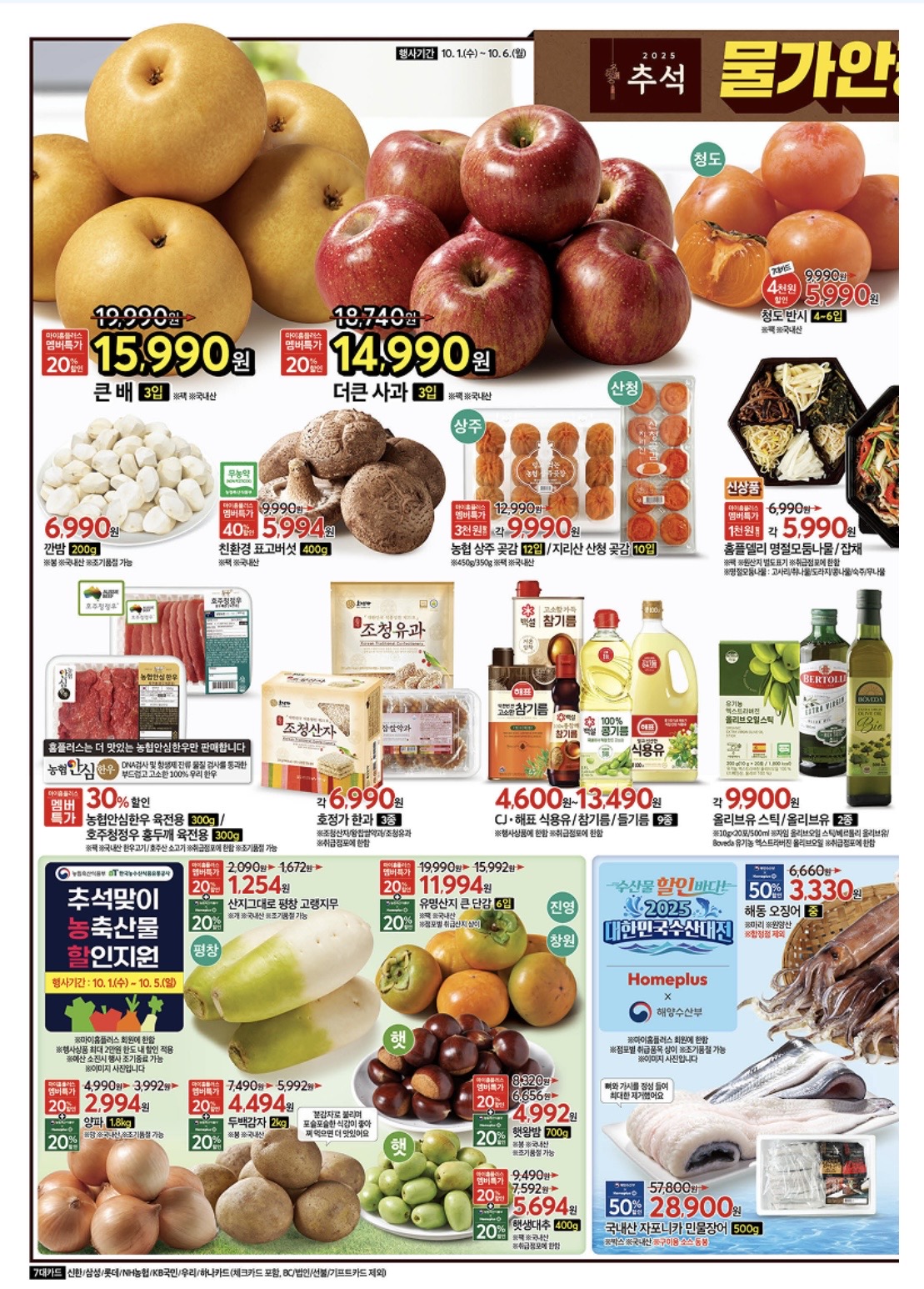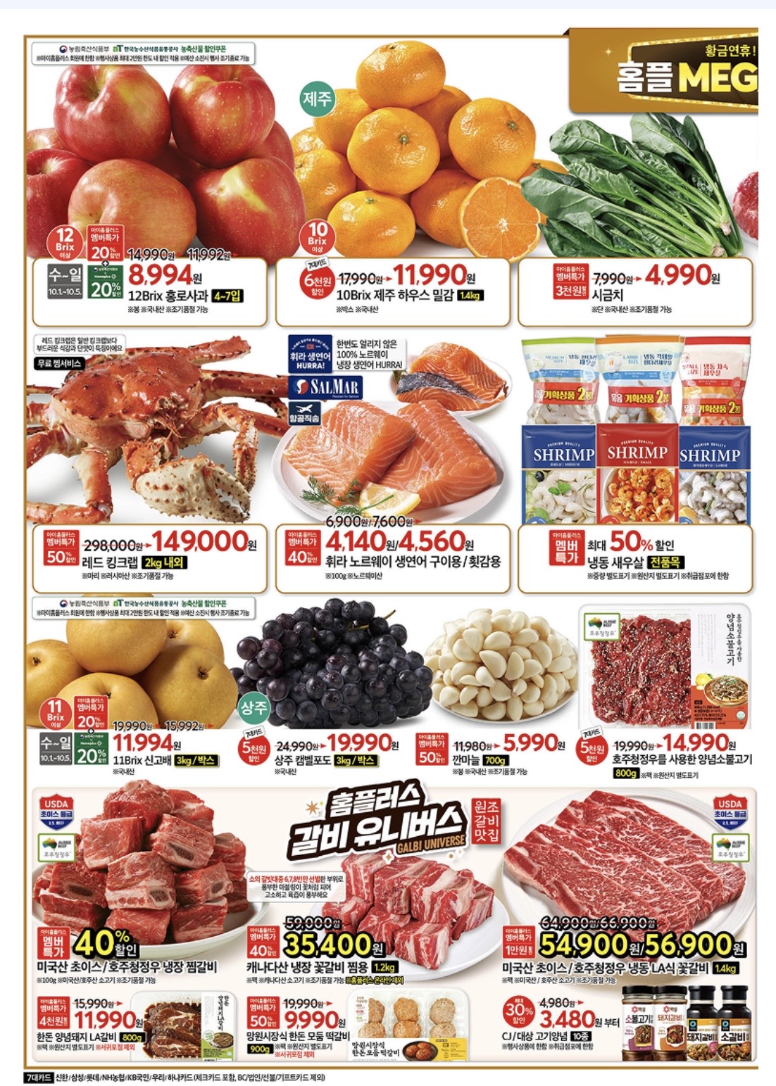 홈플러스 '메가 골든위크'(10월 1일~6일) 행사 요약: 한우, 과일, 수산물, 가공식품 등 다양한 품목을 최대 50% 할인하며, 마이홈플러스 멤버 및 7대 카드 결제 시 추가 할인 혜택이 있습니다.