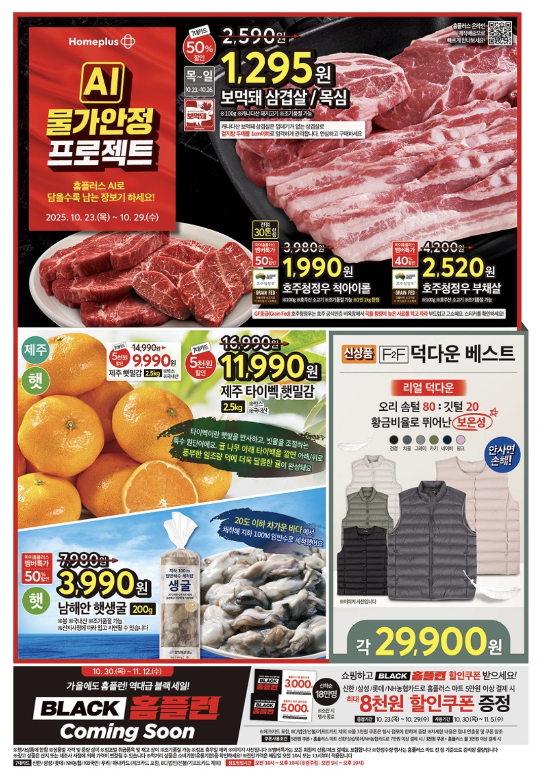 홈플러스의 ‘물가안정 프로젝트’(10월 23일~10월 29일)는 AI가 엄선한 제철 식품과 인기 먹거리를 최대 50% 할인하는 행사로, 김장철 대비 포기김치 예약과 블랙 홈플런 사전 이벤트도 함께 진행됩니다.