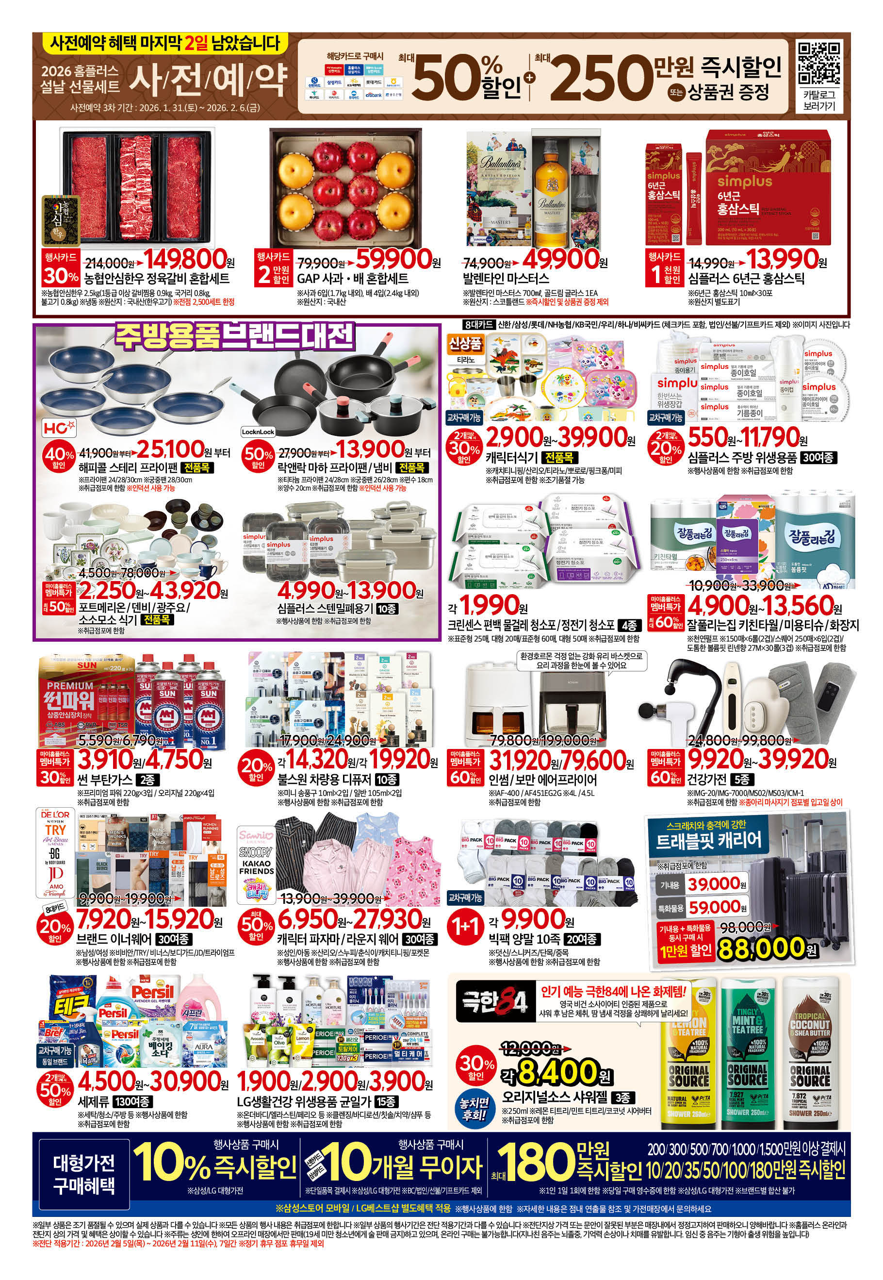 홈플러스가 2월 5일 ~ 11일 동안 진행하는 ‘설날 물가 안정 프로젝트’ 전단의 핵심은 명절 필수 먹거리(한우, 갈비, 딸기, 계란 등)를 최대 반값에 제공하는 것과, 차례상·명절 음식 재료를 합리적인 가격에 준비할 수 있도록 한정 할인 혜택을 제공하는 데 있습니다.