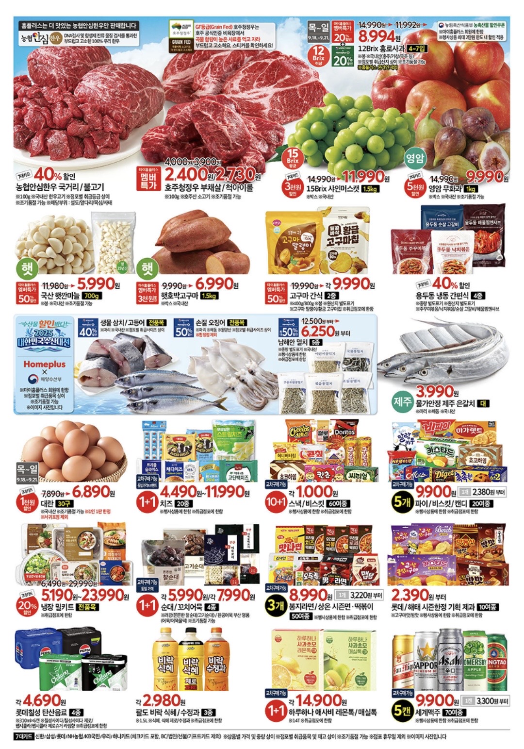- 농협안심한우 전품목: 최대 40% 할인 (마이홈플러스 회원 대상)