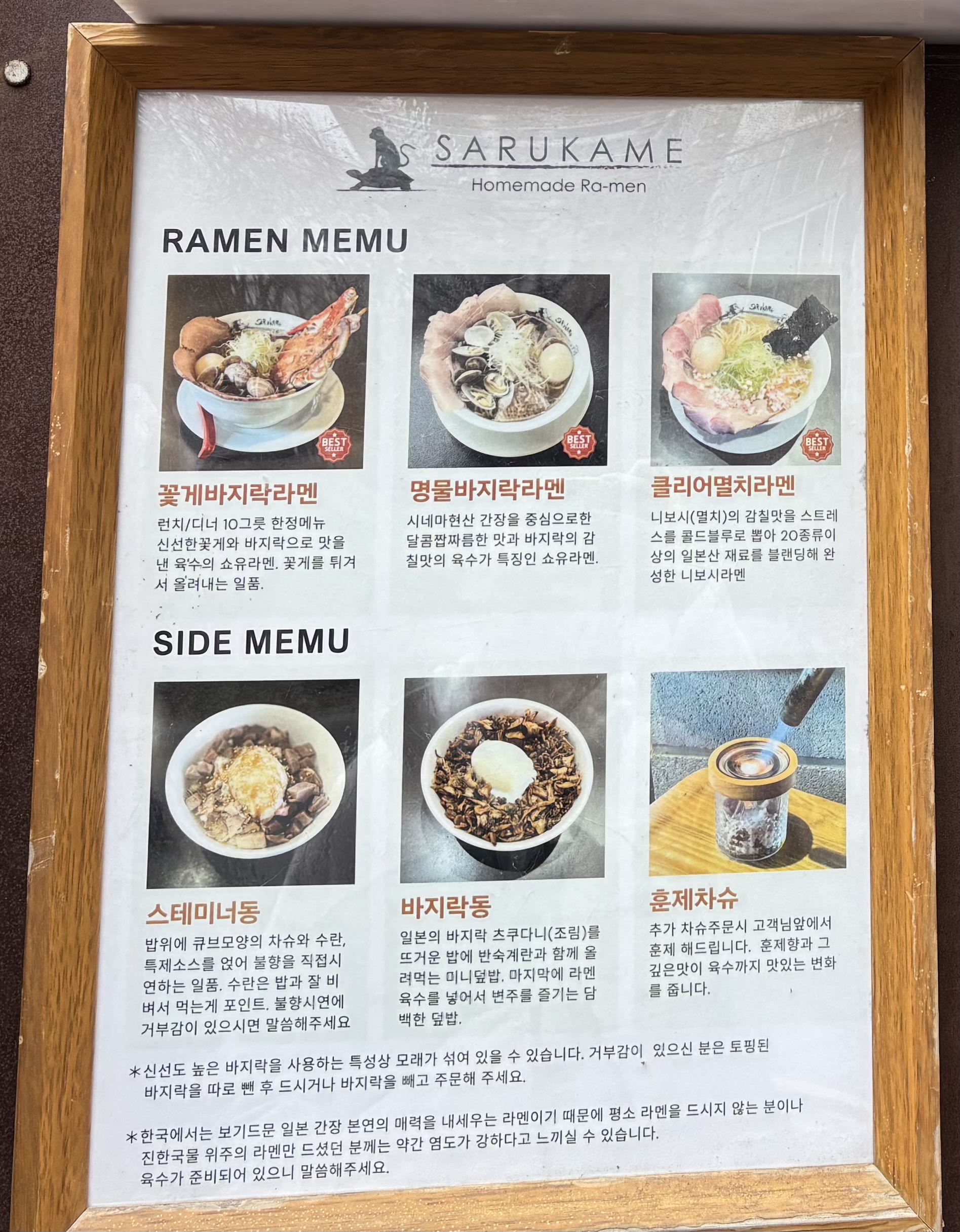 대표메뉴는 아래 사진처럼 있는데 명물바지락라멘이 메인이라고 보시면 됩니다. 이거 먼저 맛보시고 다음에 다른 메뉴도 맛보시길 추천해요. 국물이 진짜 미쳤거든요~