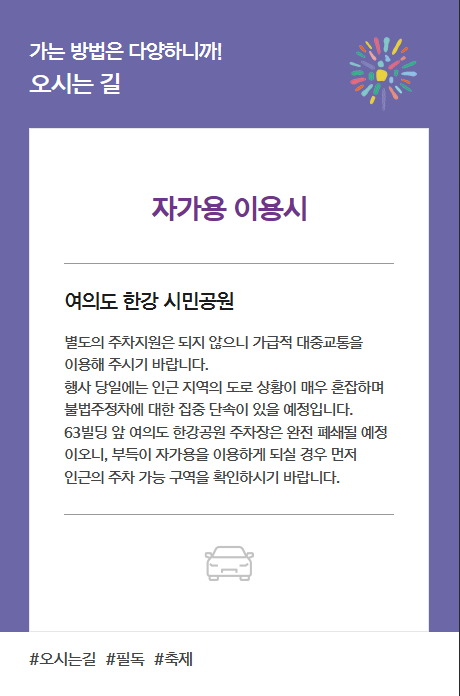 자가용 이용시에는 주차 지옥을 각오해야 할 것이다. 행사 당일에는 인근 지역의 도로 통제 또는 불법주정차 집중 단속이 있으며 63빌딩 앞 여의도 한강공원 주차장은 폐쇄된다고 한다.
