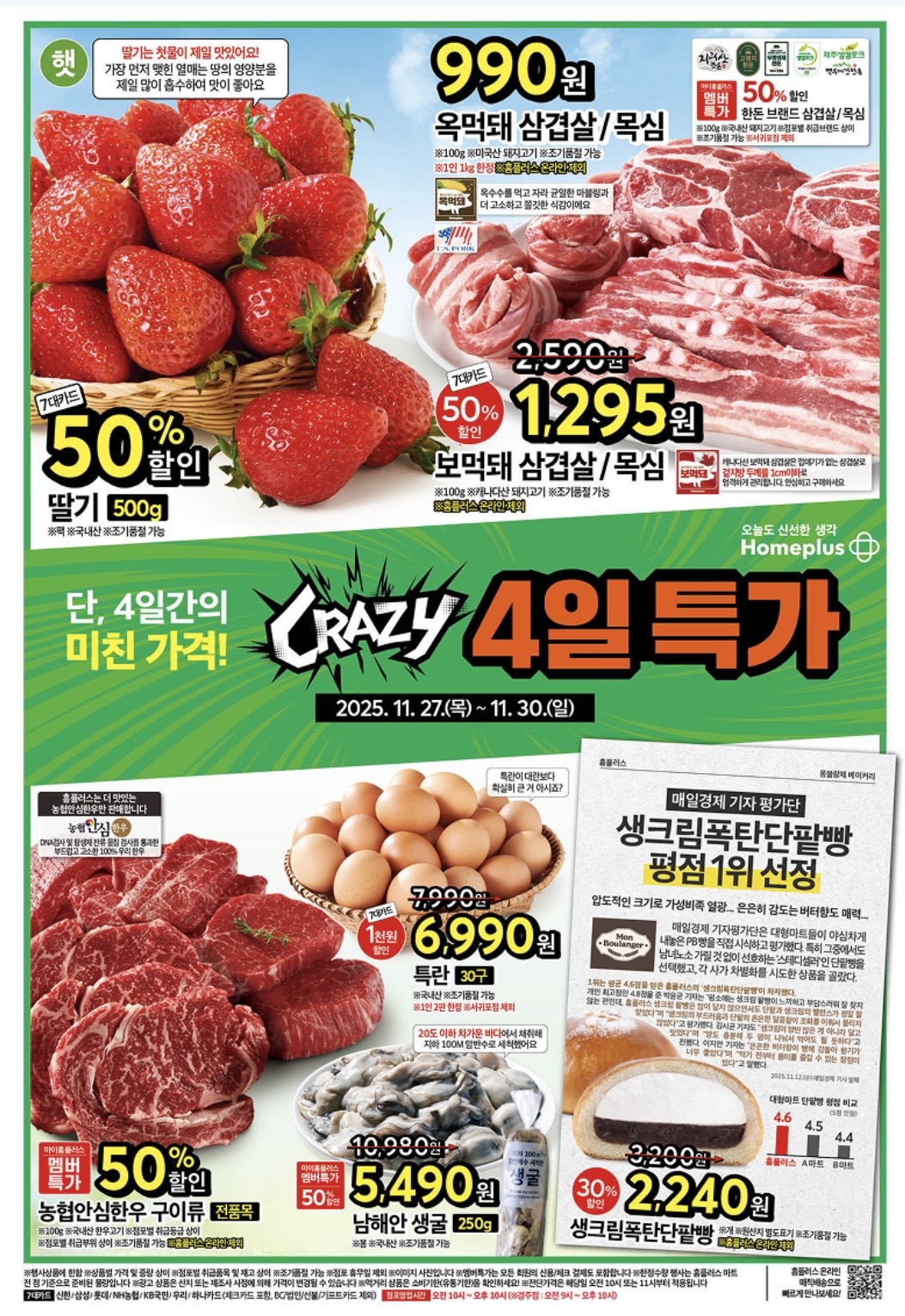 홈플러스는 11월 27일 ~ 12월 3일 동안 ‘CRAZY 4일 특가(11/27~11/30)’와 ‘탕!탕!탕! 페스타(11/27~12/3)’를 동시에 진행합니다. 딸기·삼겹살·계란 등 생활 필수품을 반값에, 한우·국물 요리 재료는 최대 50% 할인으로 제공됩니다.#홈플러스 #홈플러스행사 #홈플러스전단 #홈플러스전단지 #홈플러스행사전단지 #마트전단지 #홈플러스행사전단 #마트행사 #마트행사전단지 #마트행사전단행사 개요기간: 2025년 11월 27일(목) ~ 12월 3일(수)메인이벤트:CRAZY 4일 특가 (11/27~11/30) → 단 4일간 초특가탕!탕!탕! 페스타 (11/27~12/3) → 겨울 국물 요리 재료 할인CRAZY 4일 특가 (11/27~11/30)딸기(500g): 행사카드 결제 시 반값보리먹..