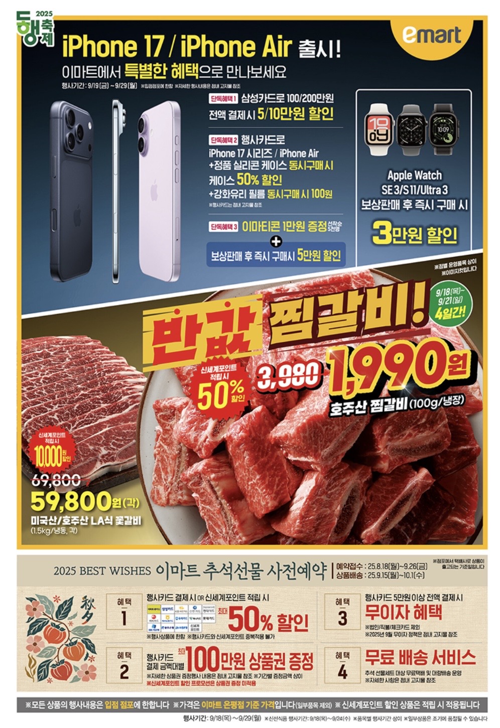 🛍️ 이마트의 9월 18일~29일 전단 행사에서는 신선식품부터 명절 선물세트, 생활용품까지 다양한 품목이 할인 중이에요.아래에 핵심 내용을 정리해 드릴게요. 🍎 신선식품 할인아리수 사과 1.3kg: 12,900원 (신세계포인트 적용 시)영암 무화과 16~20입: 9,980원햇 피땅콩 1kg: 8,980원햇 인삼 750g: 29,800원저탄소 인증 배 2kg: 10,486원수입 포도 전품목: 30% 할인 (신세계포인트 적용 시)🍖 육류/델리코너반값 찜갈비 (9/18~21): 100g당 1,990원 (신세계포인트 적용 시)LA 식 꽃갈비 1.5kg: 59,800원한돈 간장/고추장 제육 1kg: 8,980원피코크 떡갈비 900g: 14,980원피코크 송편/청국장 등: 행사 기간 중 20~30% 할인🍕 ..