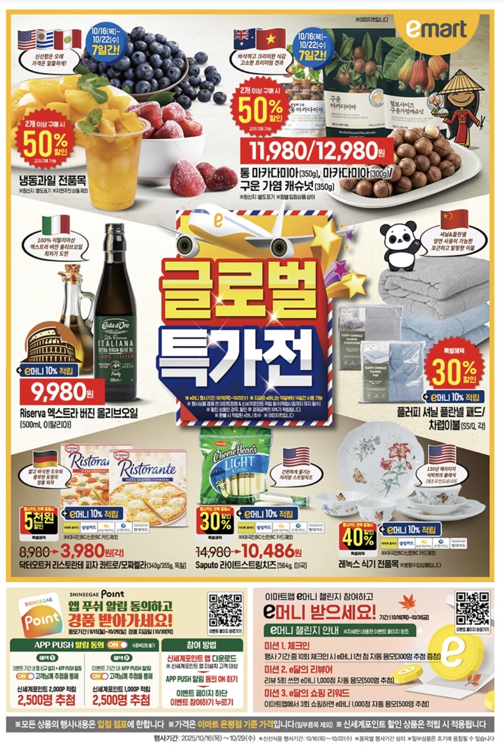 이마트 '글로벌특가전'(10월 16일~22일)에서는 냉동과일, 견과류, 올리브오일, 이불, 피자, 치즈, 식기 등 다양한 품목을 최대 50% 할인하며, 행사카드 결제 시 추가 할인과 e머니 적립 혜택도 제공됩니다. 이번 주 이마트 전단 행사인 글로벌특가전은 2025년 10월 16일(목)부터 10월 22일(수)까지 진행되며, 다음과 같은 주요 할인 품목과 혜택이 포함되어 있습니다. 🛒 주요 할인 품목냉동 과일 전 품목: 2개 이상 구매 시 50% 할인통 마카다미아 / 구운 가염 캐슈넛: 2개 이상 구매 시 50% 할인Riserva 엑스트라 버진 올리브오일: 9,980원 + e머니 10% 적립플러피 셔닐 플란넬 패드/차렵이불 (SS/Q): 30% 할인 + e머니 10% 적립닥터오트커 리스토란테 피자 콰트로..
